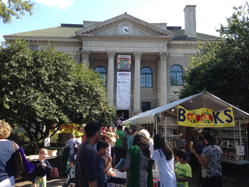 On Saturday, I parked a few blocks from the square, walked past a long metal fence full of trumpeting morning glories, and arrived in the lively square filled with children eating popsicles, the scents of kettle corn and chicken gyros, and booth upon booth of books, local Georgia products, authors, literary magazines and editors, and playful creative opportunities.