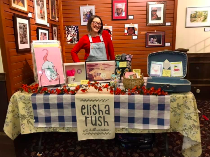 Unlike me, Elisha Rush finds inspiration in both the mundane and the magical. Her artwork features native Appalachian creatures such as possums and foxes, domestic pets, and mythical cryptids from local legends. Her cheerful, cartoony style makes even the Grafton Monster look like someone you would want to grab an ice cream cone with and gives possums the sweet look of a house cat.